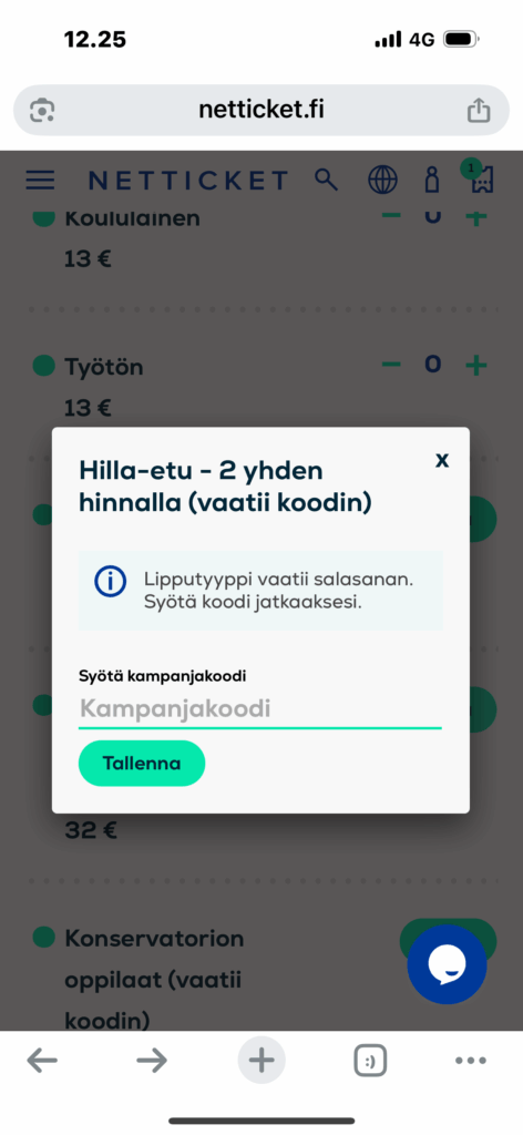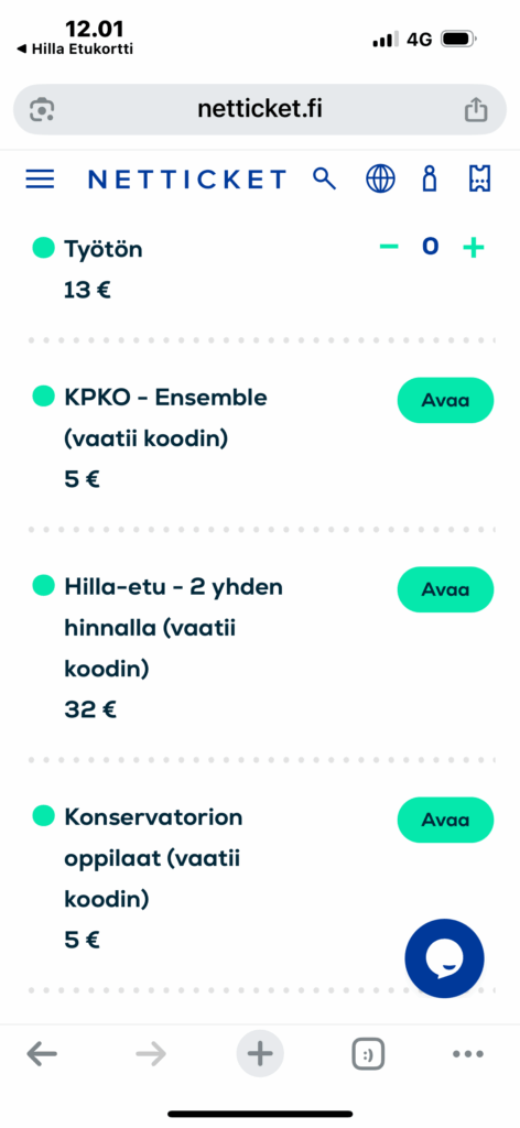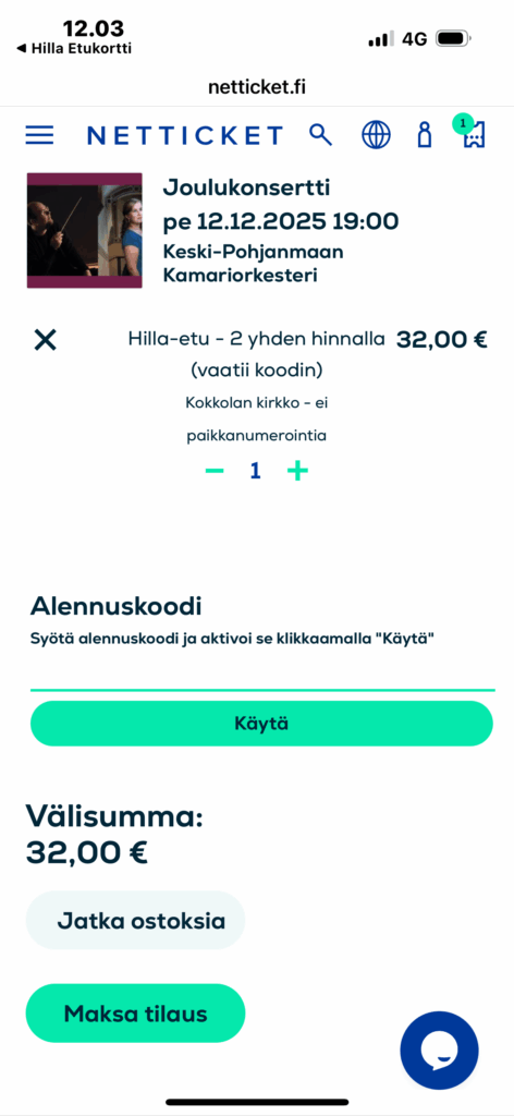 Lataamalla Hilla Etukortti–sovelluksen voit lunastuskoodilla lunastaa etuliput ennakkoon netticketistä. Valitse lippukategoria: Hilla-Etu -2 yhden hinnalla (lipputyyppi sisältää kaksi lippua) – Lisää kampanjakoodi, minkä näet Hilla-Etukorttisovelluksessa olevasta joulukonserttikupongista.